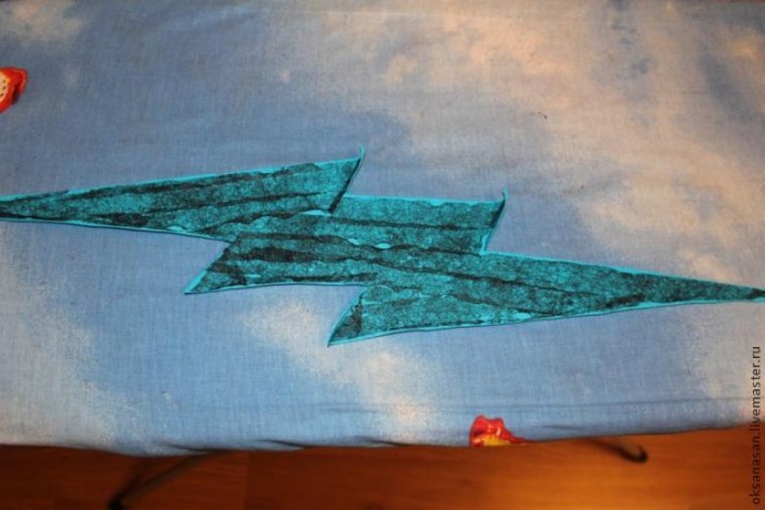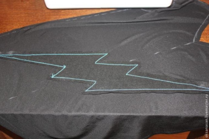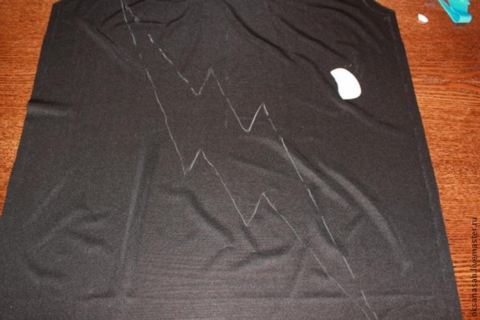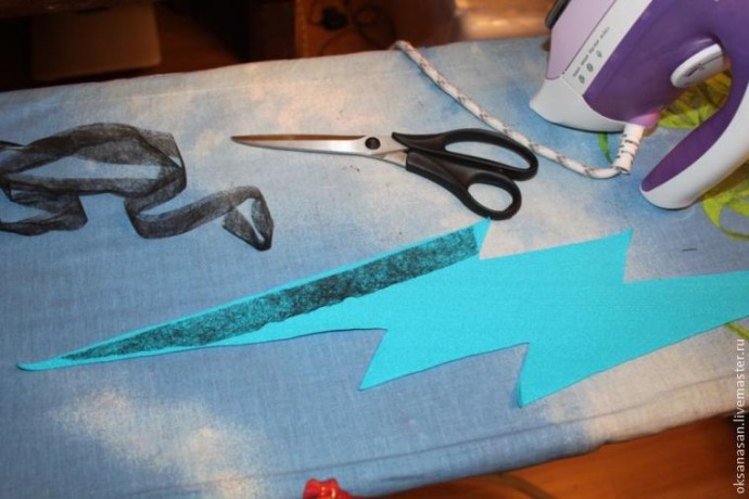 Придумываем рисунок, у меня это молния, и рисуем на бумаге выкройку. Прикалываем ее к бифлексу, обводим мелом и вырезаем.