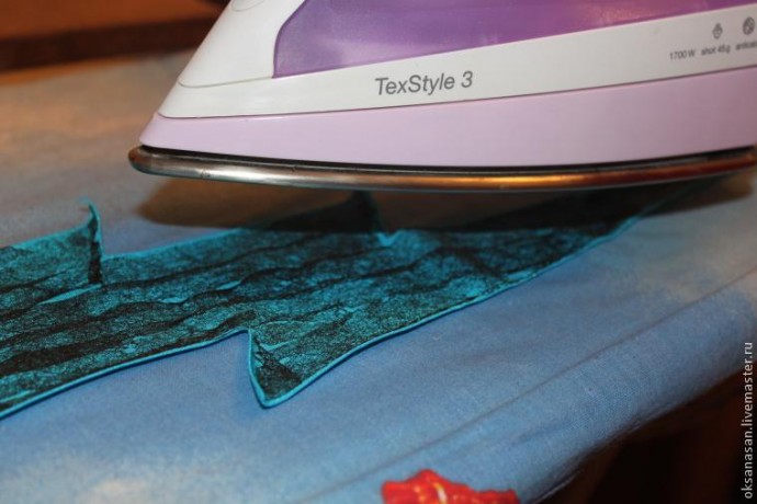 Переворачиваем заготовку из основной ткани на лицевую сторону, прикладываем аппликацию паутинкой вниз и приклеиваем утюгом. Если паутинку не обрезать или если она случайно попала на утюг, на основной ткани могут образоваться некрасивые пятна.