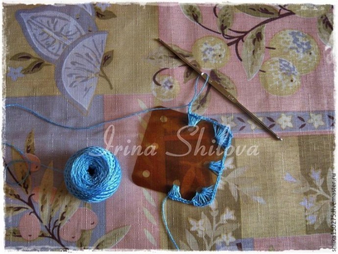 3. Затем каждый квадратик при помощи крючка и любой пряжи (я использовала Ирис), обвязать столбиками. В каждой дырочке — 3 столбика, в угловых дырочках — 6 столбиков.