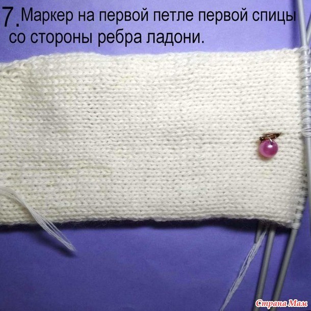 Где начинать прибавки и вешать маркер? Для этого вспоминаем математику. Рассчитываем количество петель для большого пальца - опять же по образцу. Допустим, получилось, что требуется для пальца 16 петель, как у меня. Вычитаем из 16 четыре петли перемычки, которые мы наберем для ладони после того, как снимем петли большого пальца на булавку. Ещё вычтем 2 петли, которые лично я набираю с каждой стороны от прорези пальца (для того, чтобы не было дырок). И получается, что для пальца нам нужно сделать 10 прибавок.