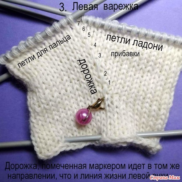 Второе касается места начала прибавок. На правой варежке это, ориентировочно, место между третьей и четвертой спицей.