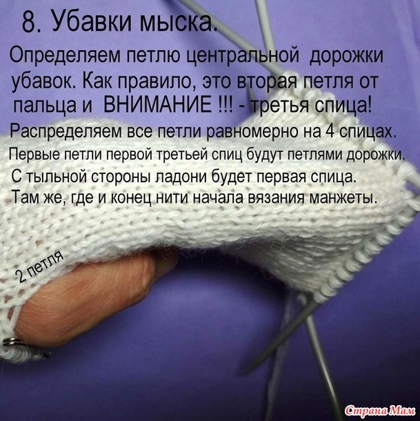 Любителям острых мысков советую делать убавки альтернативным способом. Не в каждом ряду, а через ряд и начинать их после того, как варежка по длине закроет мизинец.