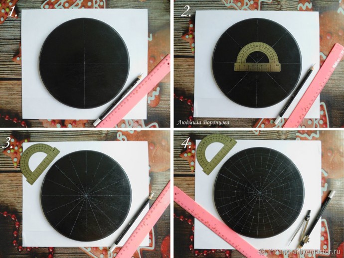 Белым универсальным карандашом наносим разметку. Здесь очень важно сохранить точность. Уделите этому этапу особое внимание. Круги (фото 4) я рисую циркулем в произвольном порядке.