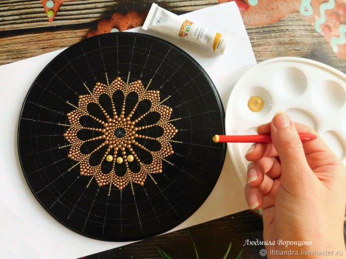 Итак, начнём! Пластиковую палочку обмакиваем плоским концом в акриловую краску (сусальное золото, Decola) и аккуратно ставим точки среднего размера. Это несложно, однако, новичкам советую потренироваться на какой-нибудь поверхности.