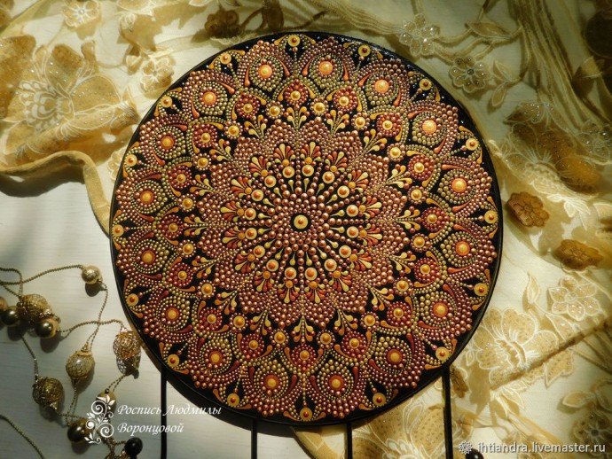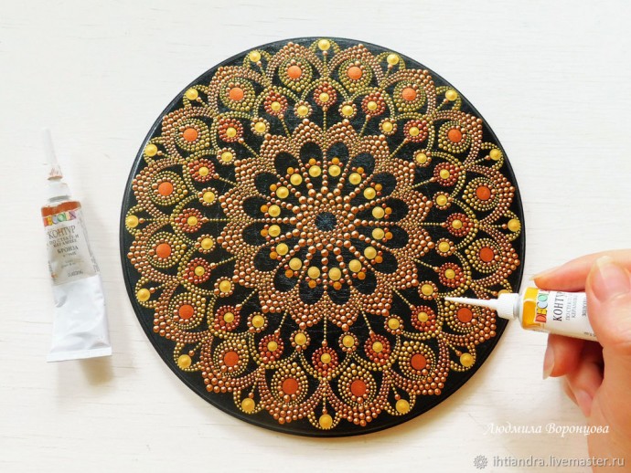 Образовавшиеся пустые чёрные участки заполняем узорами точечной росписи, также используя наши контуры (бронза, золото, медь). Предварительно можно нанести разметку белым карандашом.
