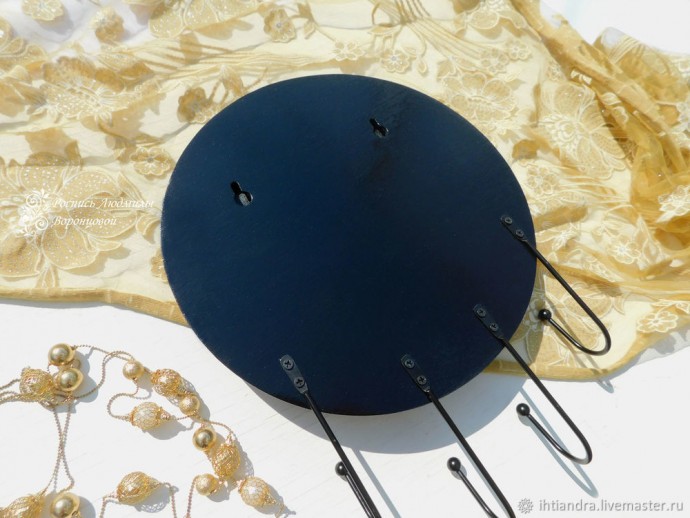 Закрепляем роспись акриловым глянцевым лаком Decola. Так как я люблю функциональные вещи, придумала прикрутить к панно металлические крючки.