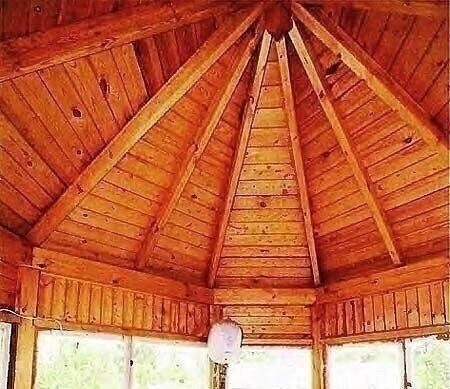 Крыша беседки представляет собой восьми-гранный купол — изнутри она обшита вагонкой.