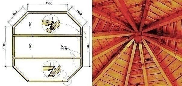 Слева — схематичный чертеж сборки нижней обвязки, справа — фото крыши беседки. Что представляет из себя конструкция, в каком порядке сооружать беседку