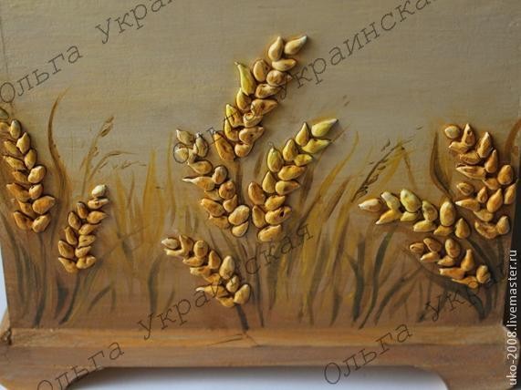 Затем карандашом наметила расположение колосьев и начала выполнять их в объеме,выдавливая капельки. С торцов будут "поля" с колосьями,а на ящичках и гнутой крышке сверху собрала колоски с полевыми цветами "в букетики". Зернышки получаются с помощью такого пластикого бутылька, который я заправила шпатлевкой