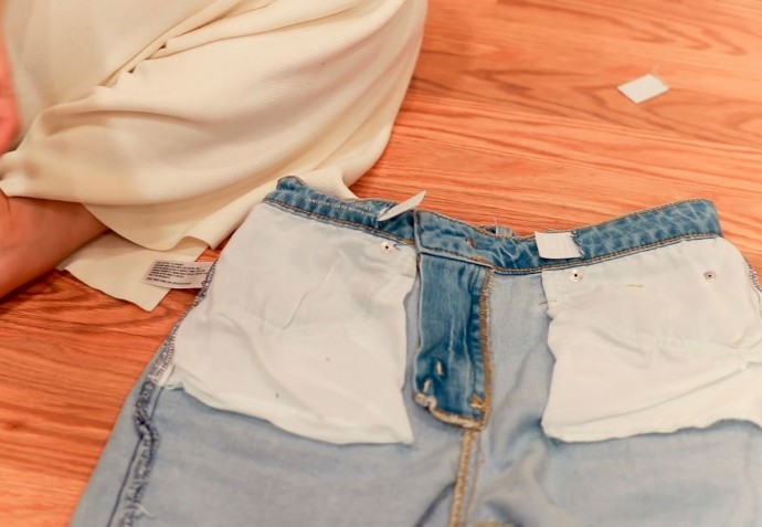 Убедитесь, что вы разрезаете только внутреннюю часть пояса. Однажды я хотела сделать рваные задние карманы на своих джинсах и разрезала два слоя ткани. Пришлось потом зашивать.