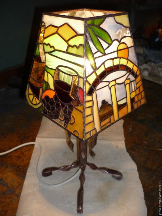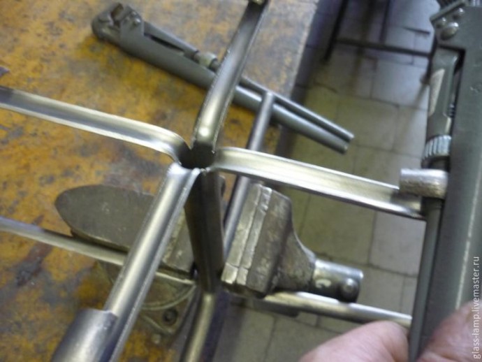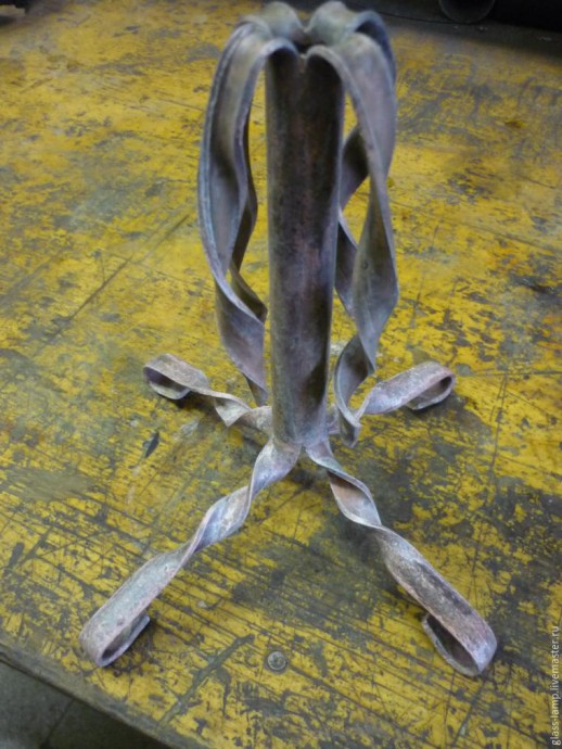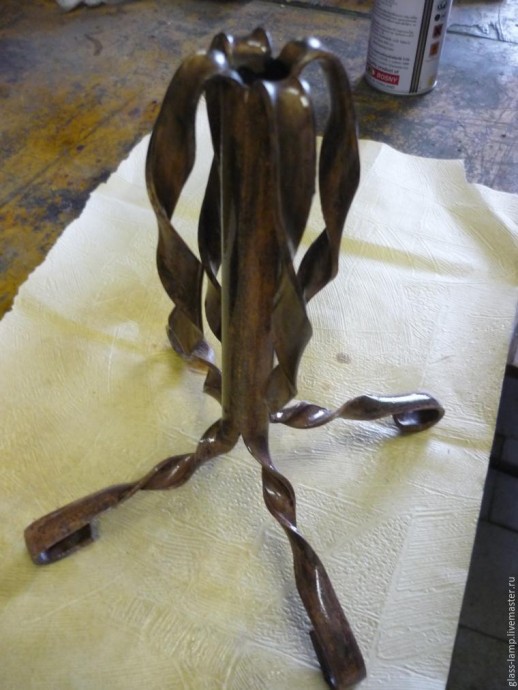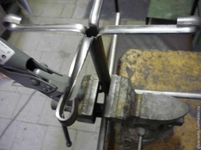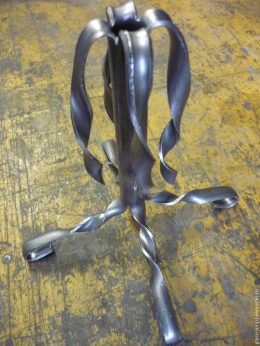На этом месте я не ставлю акцентов. Варианты загибов, изгибов, кручений, радиусов и тому подобное должны быть конкретными для каждого случая и сочетаться с основным элементом — абажуром. И конечно надо учитывать имеющиеся подручные приспособления с мускульной силой рук мастера. Вышеупомянутый абажур у меня 4-граный прямых форм, поэтому задумка попроще, чем допустим в других моих проектах, где абажур похож на полусферу (Виноград, Осень).