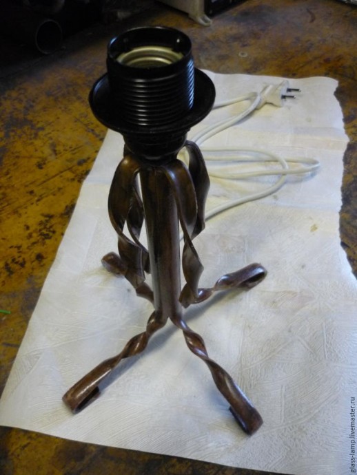 Далее завершающий этап — электромонтажные работы. Это установка патрона для лампы, электрошнура с вилкой и проходного выключателя на шнур. Словом, все должно быть как и у обычных светильников, продающихся в магазинах.