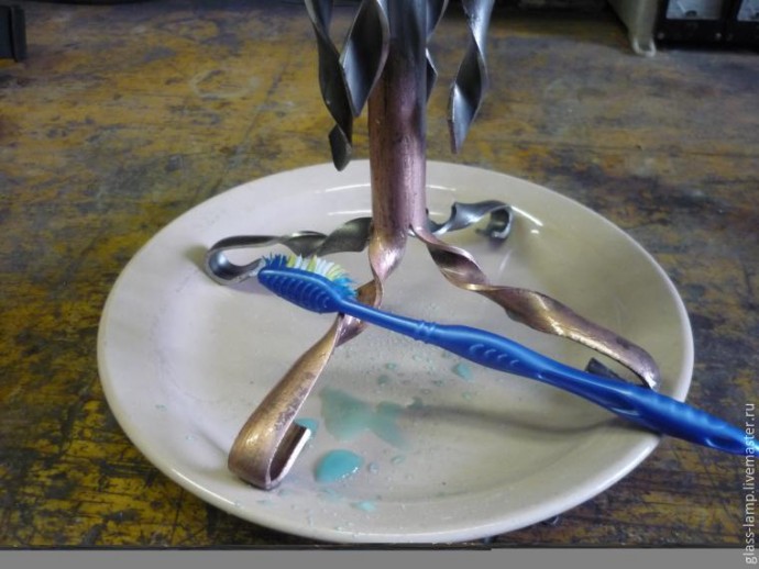 Далее медный купорос растворяю водой до насыщения (это когда он перестанет растворяться) в пластиковом стаканчике. И используя старую зубную щетку, наношу раствор до появления патины на стальной поверхности. Так моя труба-подставка немного состарится, что конечно будет сочетать ее с абажуром, где паяные швы в технике Тиффани аналогичного цвета.