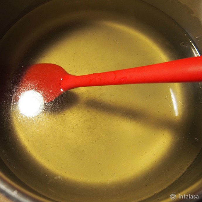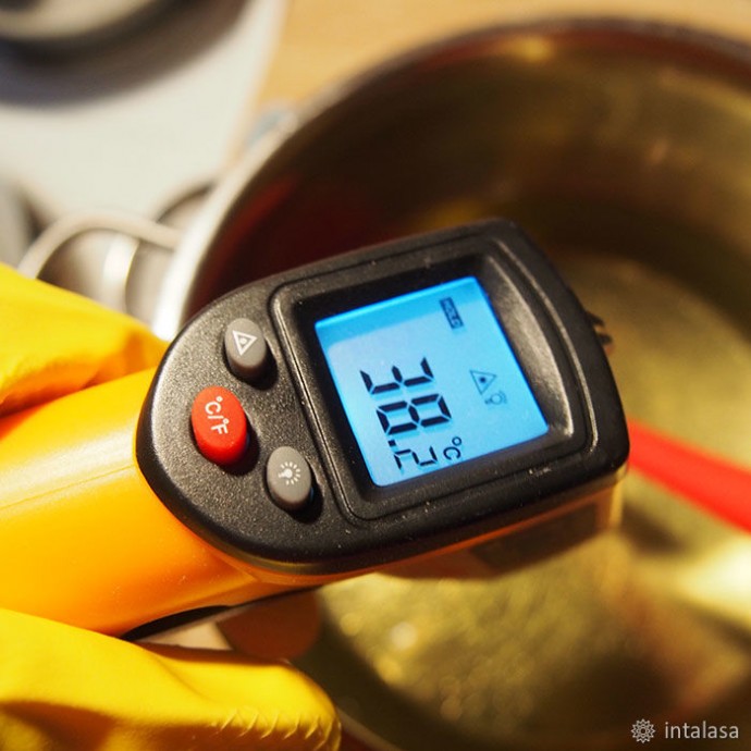 8. Когда она растворится полностью, замеряем температуру масел и щелочи. Нужно чтобы они различались не более, чем на 5 градусов, поэтому я чуть подогреваю щелочь на водяной бане.