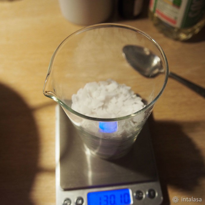 6. Отвешиваю нужное кол-во щелочи, предварительно облачившись в химзащиту.
