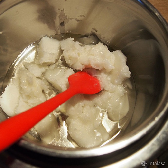 3. Взвешиваю нужное количество твердых масел и ставлю плавиться на водяную баню. Важно — расплавить масла а не нагреть их до максимально возможной температуры, поэтому бдительно слежу за процессом.