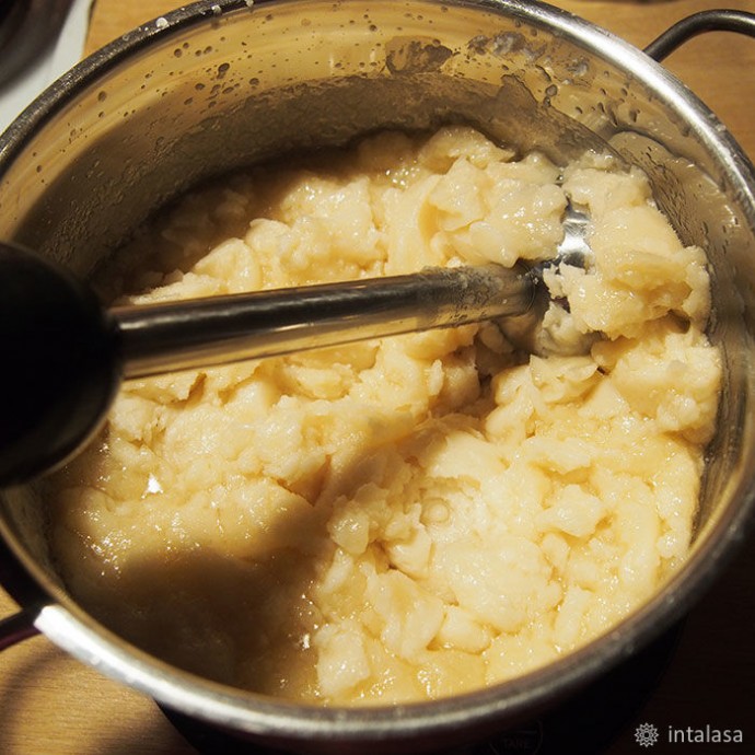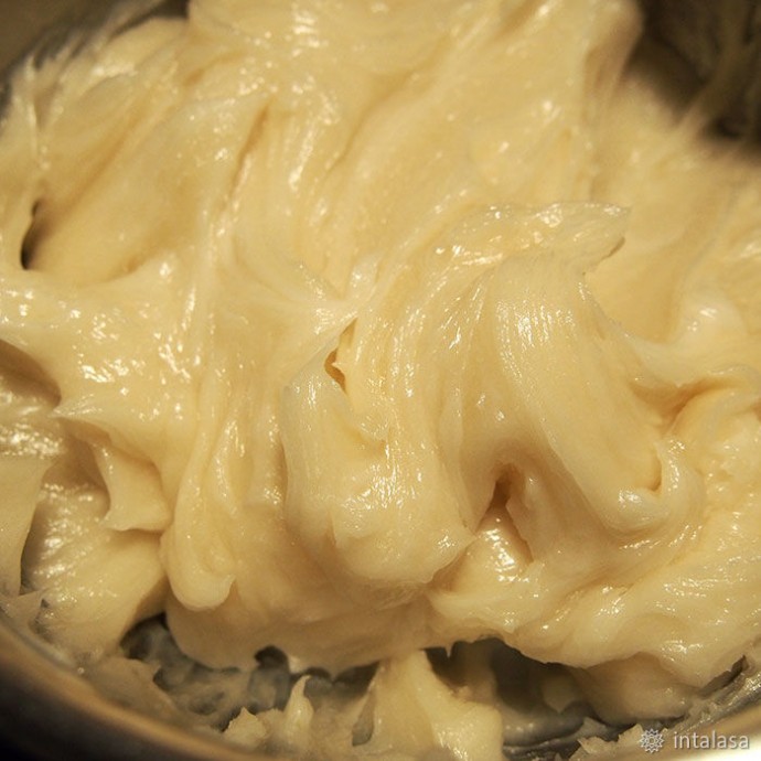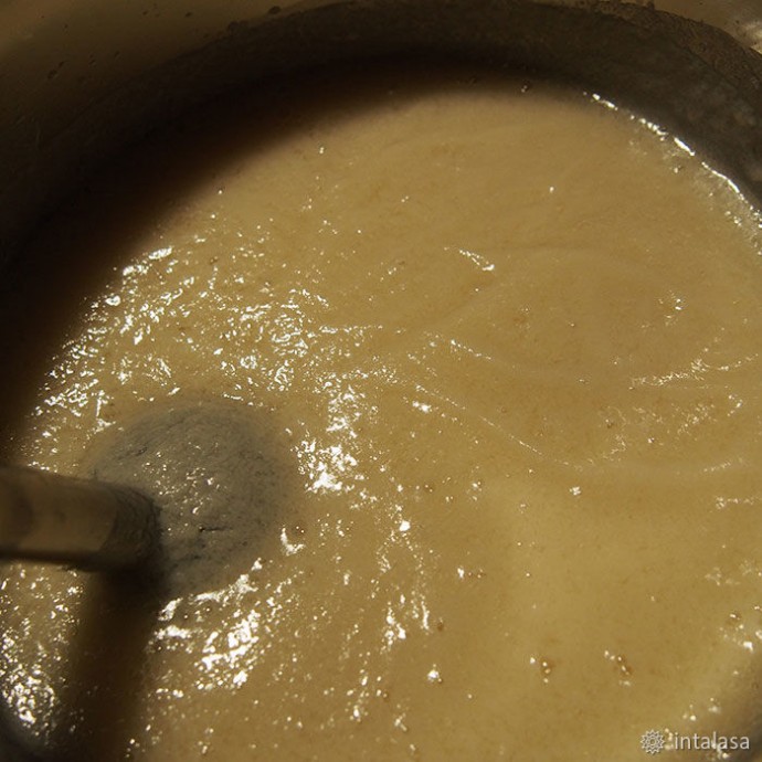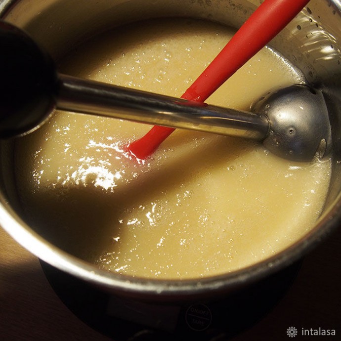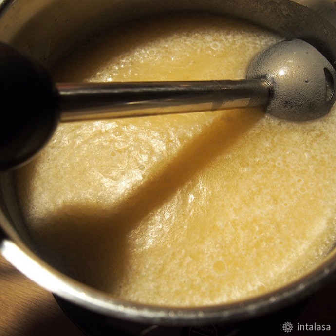 9. Вливаю щелочь в смесь масел, вооружаюсь блэндером и… мешаю. Чего уж там :) Это долгий процесс. Поэтому — пару минут блэндером, потом ложкой. Фишка — постоянно бултыхать калийное мыло бессмысленно, процесс входа в след это не ускорит, поэтому поболтав смесь ложкой — оставляю ее отдыхать минут на 15, потом опять блэндером и ложкой, и вновь — пусть отдыхает. Масса пузырится, творожится, расслаивается, но это нормально. Не пугаюсь и продолжаю вымешивать.