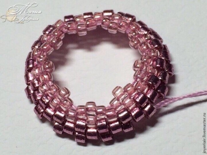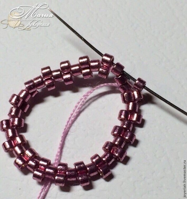 Затем набираем 36 бисеринок Delica, продеваем иглу с ниткой через петлю, которая у нас образовалась, и затягиваем.