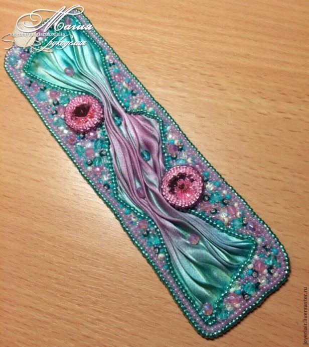 Берем металлическую основу размером чуть меньше, чем вышитая заготовка, придаем ей круглую форму браслета (сгибаем от края к центру с помощью цилиндрического тюбика диаметром 3,5-4 см). Это очень важно — обшивать именно на согнутой основе (лента не будет терять своих волн).