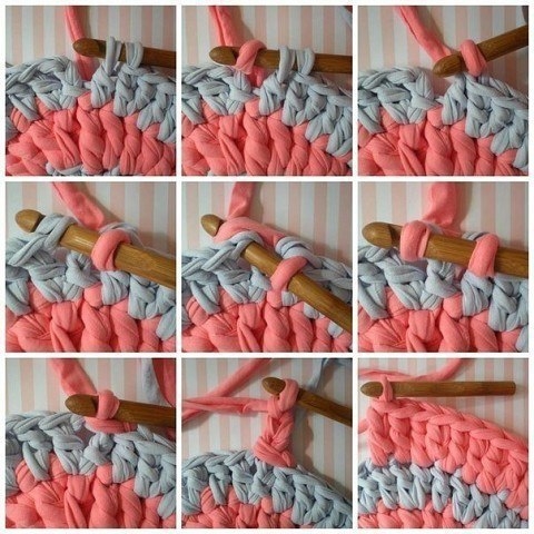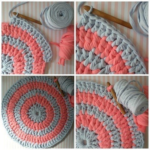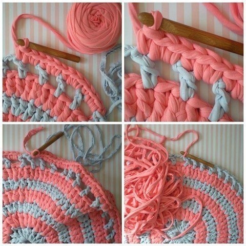 Коврик крючком из трикотажа помогает утилизировать старые трикотажные вещи и держать потом ноги на теплом полу.