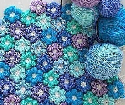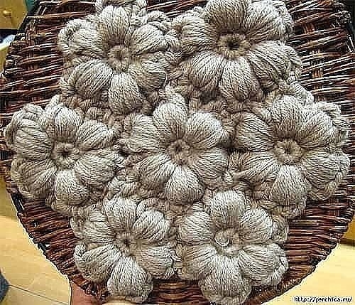 Используя эти симпатичные и несложные в вязании цветы из пышных столбиков, можно «соорудить» сумочку, коврик, или что-то другое, не менее интересное…