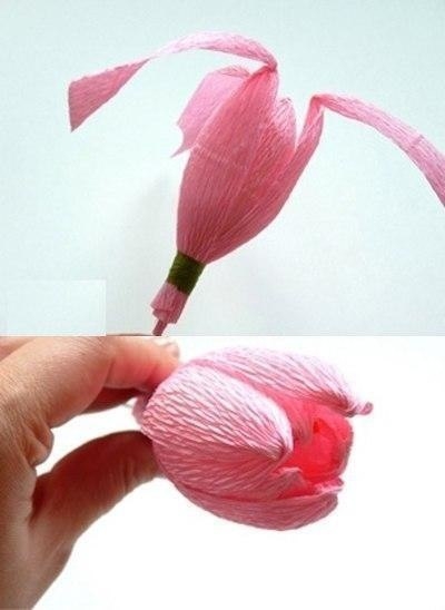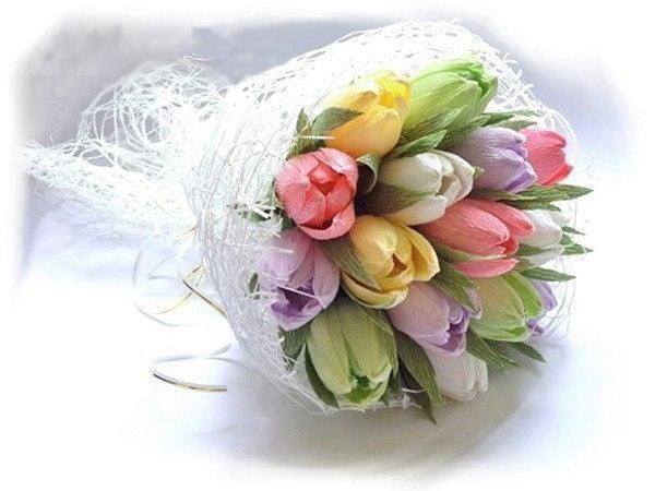 Красивый букет тюльпанов из гофрированной бумагиПока земля под снегом, делайте цветы из бумаги.Для украшения стола, например.