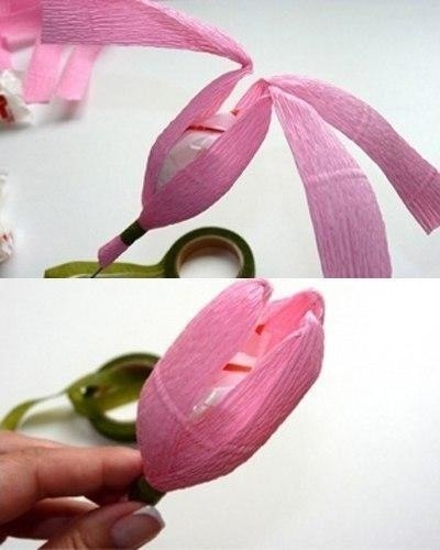 Букет тюльпанов из гофрированной бумагиБукет тюльпанов из гофрированной бумаги таит внутри сладкий сюрприз в виде конфетки.