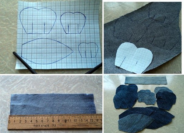 1. C джинсов срезаем боковые швы. 2. Нарезаем полоски одинаковой длины, например, по 20 см. Для такой подставки нам понадобится 19 полосок. 3. Первую горизонтальную полоску буде...