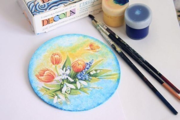8. Приклеиваем изображение на диск клеем ПВА, тщательно разглаживая и выгоняя пузыри. Сушим.Сошкуриваем лишнее с краев.