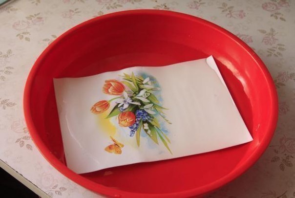 5. Теперь занимаемся открыткой. Замачиваем ее в воде совсем не долго, буквально несколько секунд, чтоб промокла вся. Если передержать, краска ничинает лопаться и слазить.