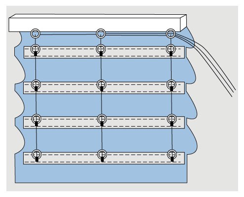 1. Отметьте на изнаночной части линии подворота, линии будущих складок и места установки колец по приведенной схеме. Важно располагать линии будущих складок на одинаковом расстоянии, иначе римская штора не будет красиво драпироваться.