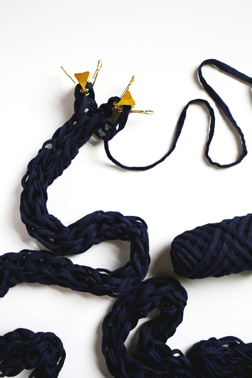 Шаг 2. Если вы прерываете работу, то закрепите петли, снятые с пальцев, двумя прищепками или зажимами. Это предотвратит распускание петель. Если закончилась пряжа одного цвета, просто привяжите конец нити другого цвета к концу предыдущего мотка.