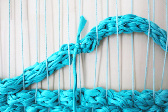 Шаг 6. Когда бечевка закончилась, а работу еще нужно продолжать, просто свяжите новый шнур и соедините узелком концы обоих шнуров. Кончики можно скрыть за нитями основы.