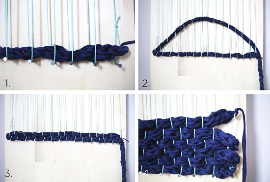 Шаг 5. Теперь берем наш шнур и протягиваем через нити, начиная снизу и так зигзагом туда и обратно, стараясь, чтобы шнур ложился плотно между нитями основы.