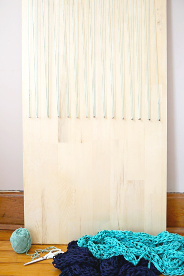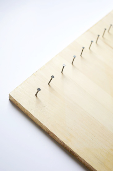 Шаг 3. Готовим «ткацкий станок». Для этого забиваем гвоздики по верхнему и нижнему краю листа фанеры. Вверху забиваем 15 гвоздиков на расстоянии 2, 5 см, внизу забиваем 16 гвоздиков в ряд на таком же расстоянии. Не столь важно, чтобы расстояние между гвоздиками было миллиметр к миллиметру, но лучше все-таки наметить места для гвоздей маркером.