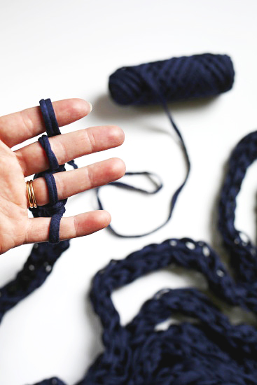 Шаг 1. Из ленточной пряжи необходимо сплести толстую бечевку. Для этого используем собственные пальцы. На плетение бечевки из одного мотка понадобится приблизительно 1, 5 часа.