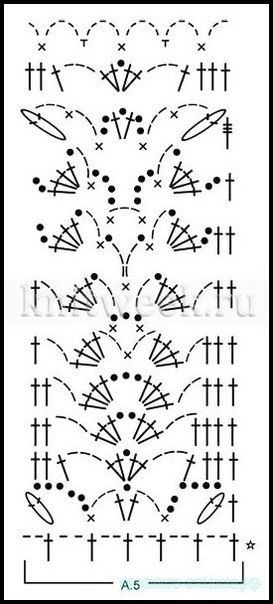 Продолжить вязание по схеме А.5, повторив гориз. раппорт 12-14-15-17-18-21 раз. Когда 1 верт. раппорт по схеме будет выполнен, отрезать и закрепить нить. Высота основной детали = 31 см, общая высота = 63-65-67-69-71-73 см.