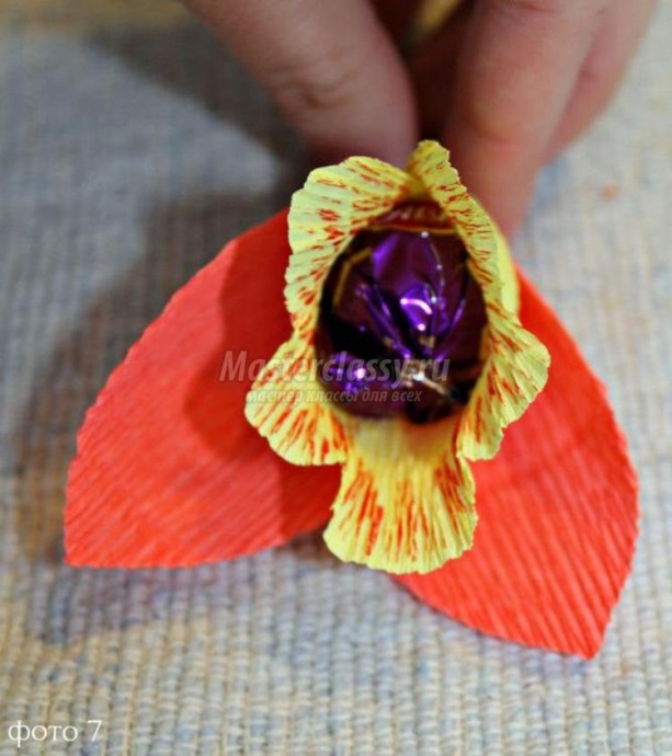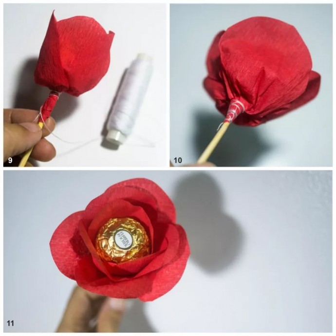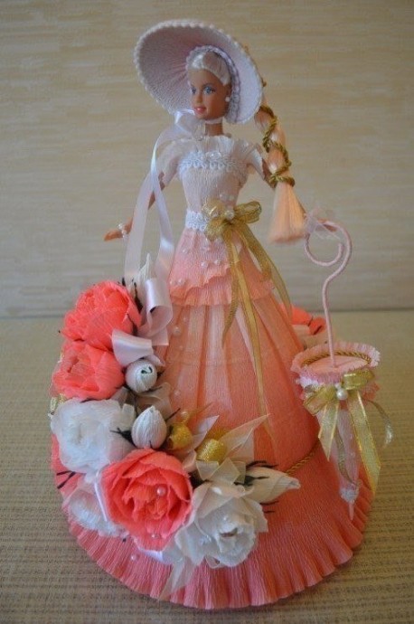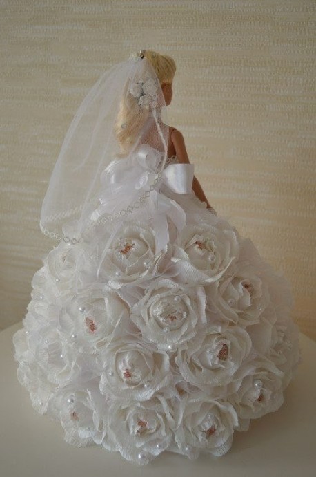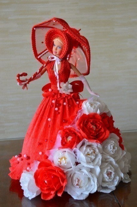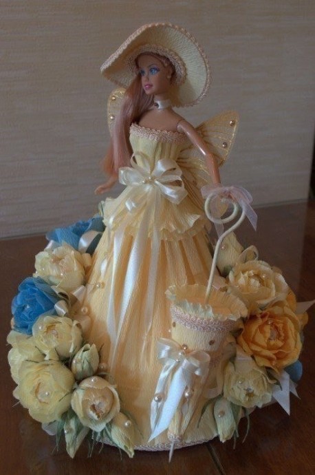 Я думаю, что надо сделать из тонкого картона конус и прикрепить к талии куклы, а на него уже все остальное — ткань. конфеты.