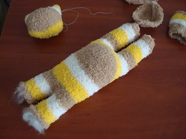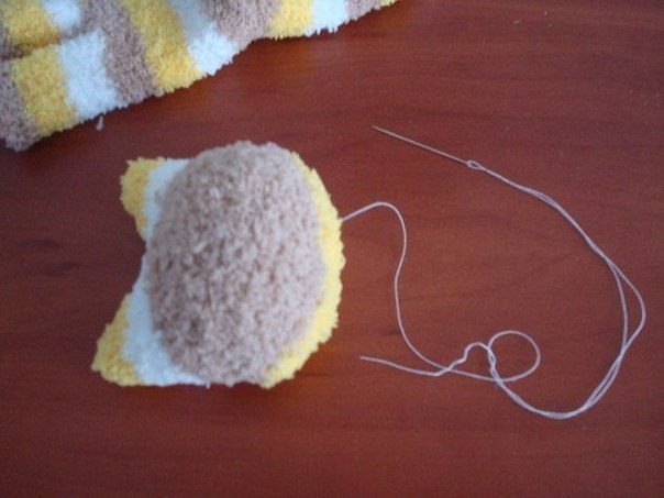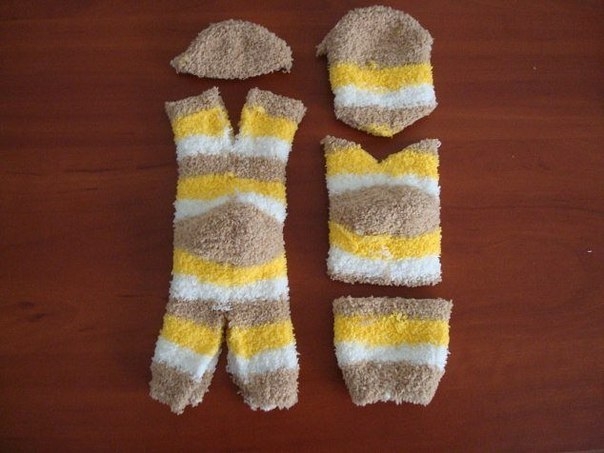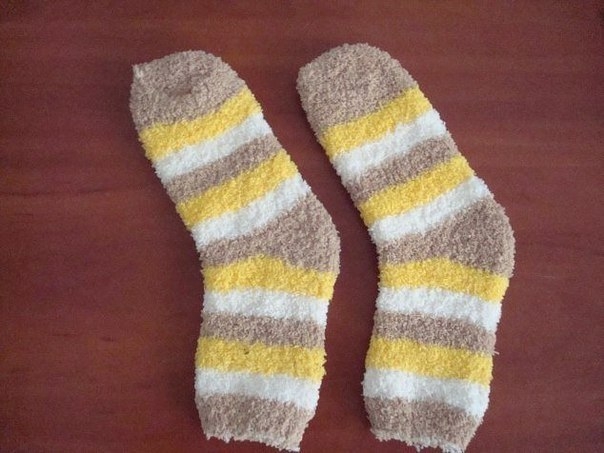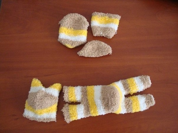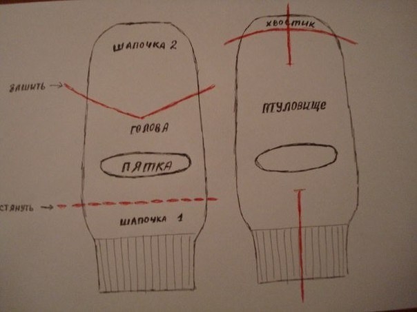 Итак, начнем. Берем носочки, лучше махровые. Складываем их пяточками вверх. Одна пятка — мордочка. вторая- попа. Нарисовалы выкройку, как разрезать. Из обрезков шьем 2 шапочки (...