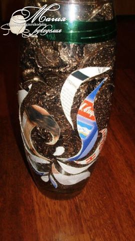 Когда будете снимать вторую сторону скотча не выбрасывайте! Составьте из этих деталей узор на другую сторону. Приклеивая его на скотч ,расположить на противоположной стороне вазы.