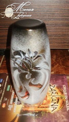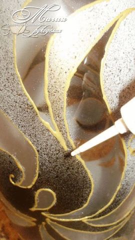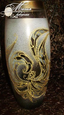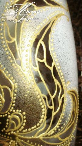 Этот этап работы проводим на свежем воздухе или в подъезде. Переворачиваю вазу верх дном и начинаем покрывать аэрозольной краской. Сначала белой распыляя краску на расстоянии 20 см от вазы, не покрывайте плотным слоем пусть присутствует воздушность, затем черной покрываем дно вазы и серединки нашего узора. В финале берем краску золото и проходим ей по ободку вазы и в серединки узора.