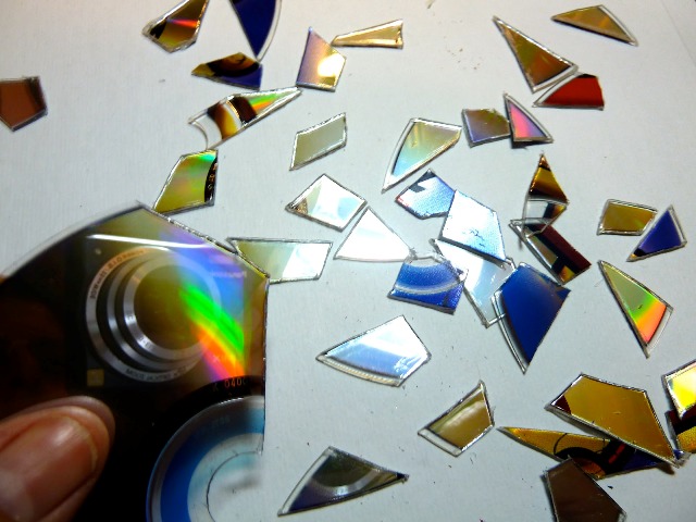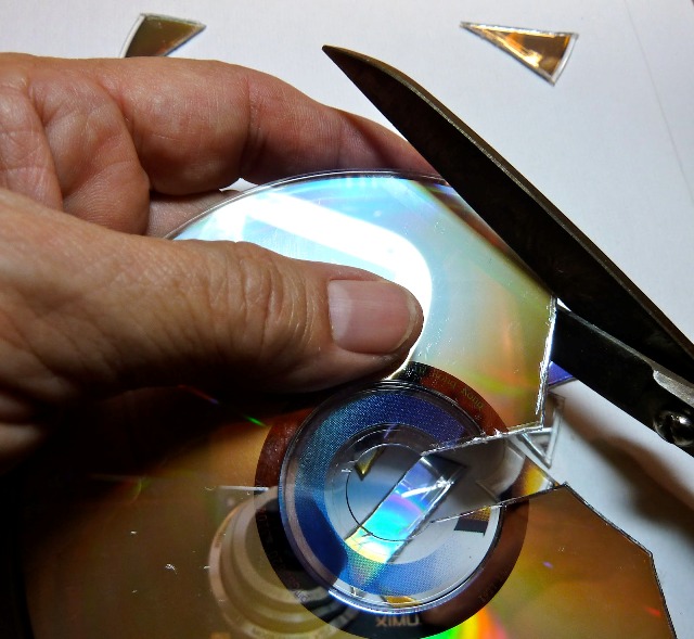 Пробовала резать диски как показано здесь в публикации, ножницами — по линии разреза очень страшно и неровно сходит радужный лазерный слой