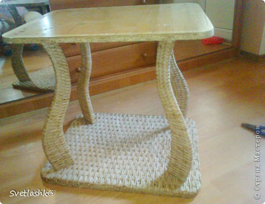 Уже лет 8 плету из ротанга (училась на специальных курсах в Малайзии), но делать такой столик??? В общем, кто сможет и у кого есть столько свободного времени — покажите, пожалуйста, что народится.
