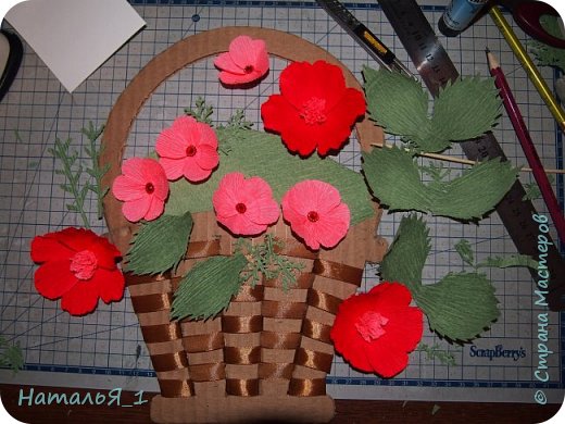 Корзинка с цветами из атласных лентМатериалы: атласная лента, пластиковая основа, картон переплётный, ткань подкладочная, клей, наполнитель синтепон, цветы из атласных лентПроцесс:...