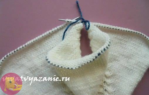 Затем поступаем следующим образом. По лицевой стороне работы провязываем петли переда (левой полочки) включительно с петлями РЛ переда лицевыми петлями (прибавления из 3-х петель 5 уже не делаем). Далее петли рукава с петлями его РЛ включительно переснимаем при помощи трикотажной иглы на толстую нить контрастного цвета, кончики нити завязываем.