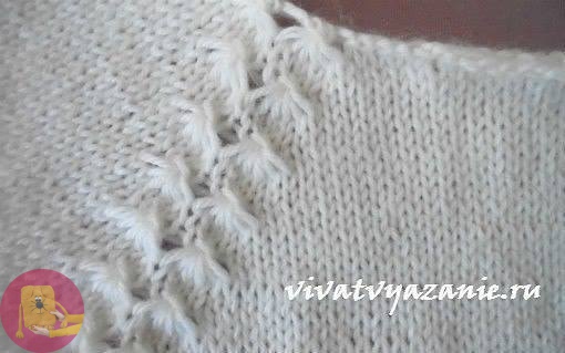 В способе, который я покажу в этом МК, будет прибавляться по 2 петли через каждых 3 ряда (в каждом 4-м ряду), что по общему количеству прибавленных петель получается то же самое. Способ такой: в каждом 4-м ряду по лицу работы нужно вывязывать из 3-х петель 5 (лицевая, накид, лицевая, накид, лицевая). Эти веерочки идут парами, по одному с каждой стороны деталей спинки, переда и рукавов, и соприкасаясь друг с дружкой образуют вот такую РЛ: