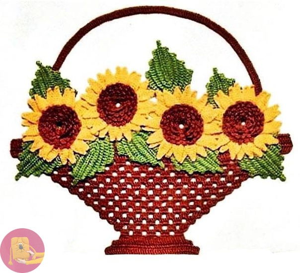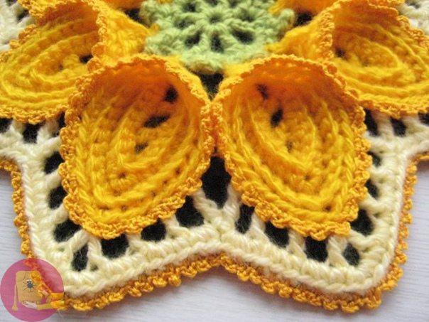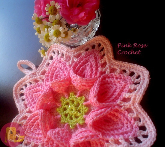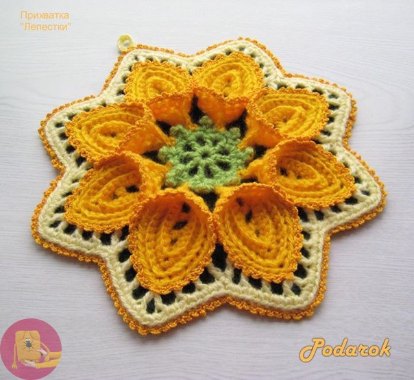 Прихватки с цветамиПрихватки с цветами связаны крючком.По аналогии вы можете связать теплые плотные круглые коврики, используя толстую пряжу.
