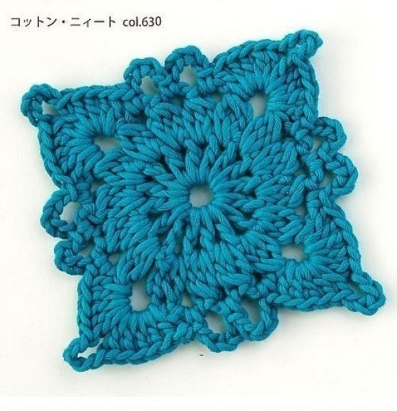 Красивый плед из квадратных мотивовМотив превращается в квадрат из круга только на самом последнем этапе вязания.