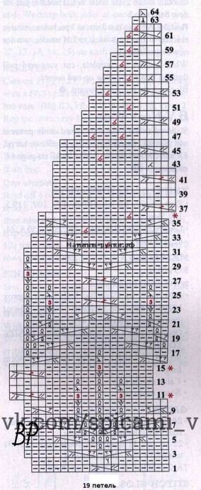 Плотность вязания, узор со схемы, спицы № 3,25: 36 п. и 37 рядов = 10 х 10 см.