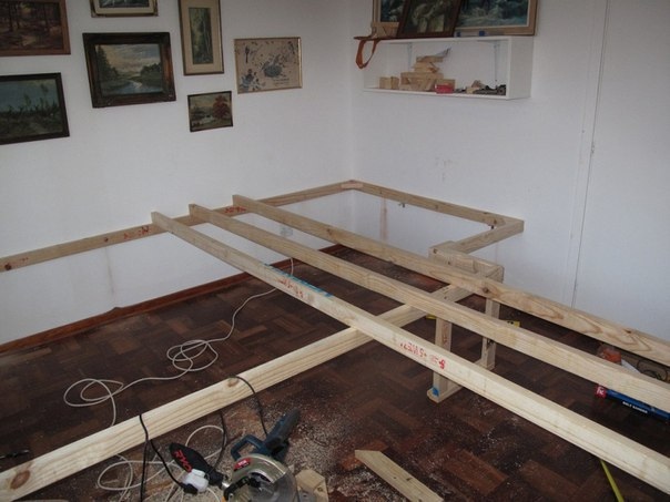 Лучше на подиум поставить кровать, а вещи, книги сложить в выдвижной ящик.